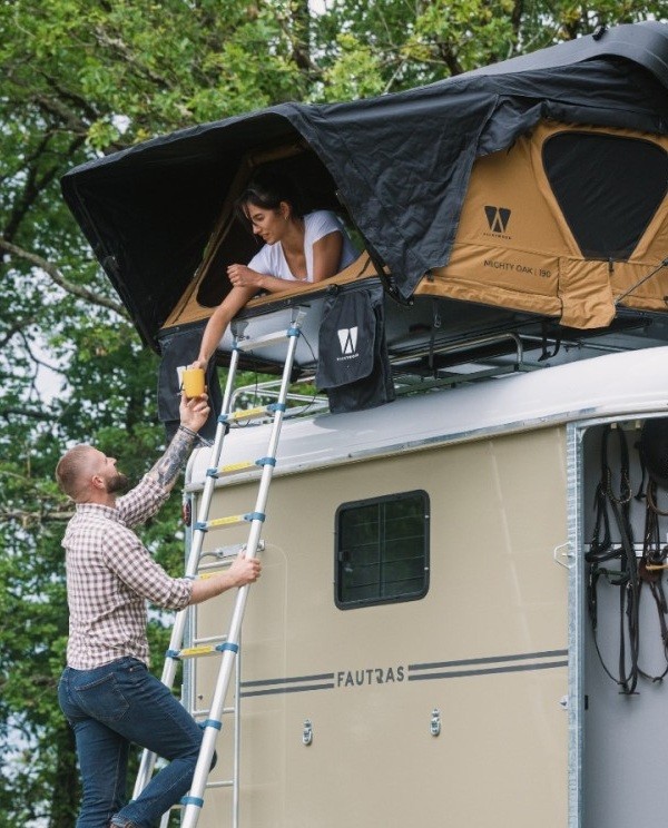Bovenop een Fautras paardentrailer met imperial kun je overnachten als je hier een tent op zet. Jouw Fautras paardentrailer is dan niet alleen voor het vervoeren van jouw paard(en), maar daarnaast ook gelijk een vouwcaravan!